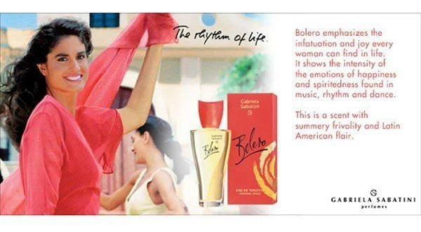 Bolero di Gabriela Sabatini è una fraganza della famiglia olfattiva floreale-fruttata per donna. Lanciata nel 1997, questa composizione presenta una piramide olfattiva che inizia con note di testa di frutti di bosco, legno di rosa del Brasile, mandarino e fiore di loto; il cuore rivela gardenia, pesca, viola e rosa; mentre la base si fonda su fava tonka, sandalo e vaniglia.