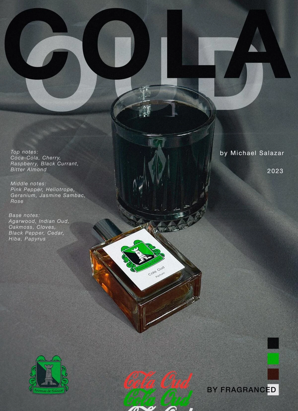 Cola Oud di Aromas de Salazar è una fragranza di famiglia olfattiva floreale, pensata per uomo e donna. Lanciata nel 2023, questa composizione è stata creata dal naso Michael Salazar. Le note di testa rivelano un'effervescente freschezza di Coca-Cola, ciliegia, lampono, mirtilli neri e mandorla amara. Il cuore della fragranza svela un'armonia speziata e floreale con pepe rosa, geranio, rosa, eliotropo e gelsomino sambac. Infine, le note di fondo ancorano l'essenza con un tocco esotico e legnoso di oud indiano, legno di oud, muschio di quercia, pepe nero, chiodi di garofano, cedro, abete bianco e papiro egizio.