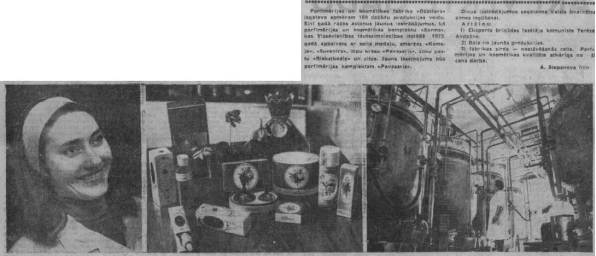 Dzintars di Dzintars è una fraganza della famiglia olfattiva chypre per donne. Lanciata nel 1959, questa composizione è stata creata dal naso Bronislava Schwarzman. La piramide olfattiva si sviluppa con note di testa di iris, bergamotto, giglio del valle e ciclamino; un cuore formato da patchouli, chiodi di garofano, fiore d'arancio, gelsomino e nardo; e un fondo che evoca muschio di quercia, sandalo, algalia e ambra grigia.