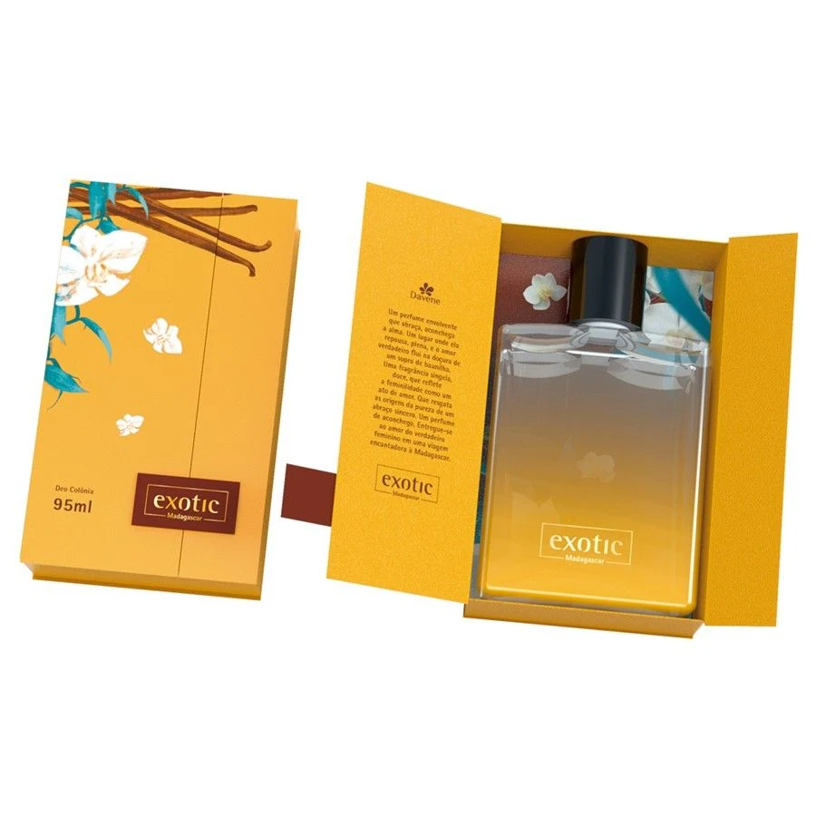 Exotic Madagascar di Davene è una fraganza della famiglia olfattiva floreale fruttata per donne. Lanciata nel 2019, questa composizione presenta nelle note di testa pesche, mandarino e fragola; nel cuore, caramello e fiore d'arancio; e nel fondo, vaniglia di Madagascar, sandalo e cedro.