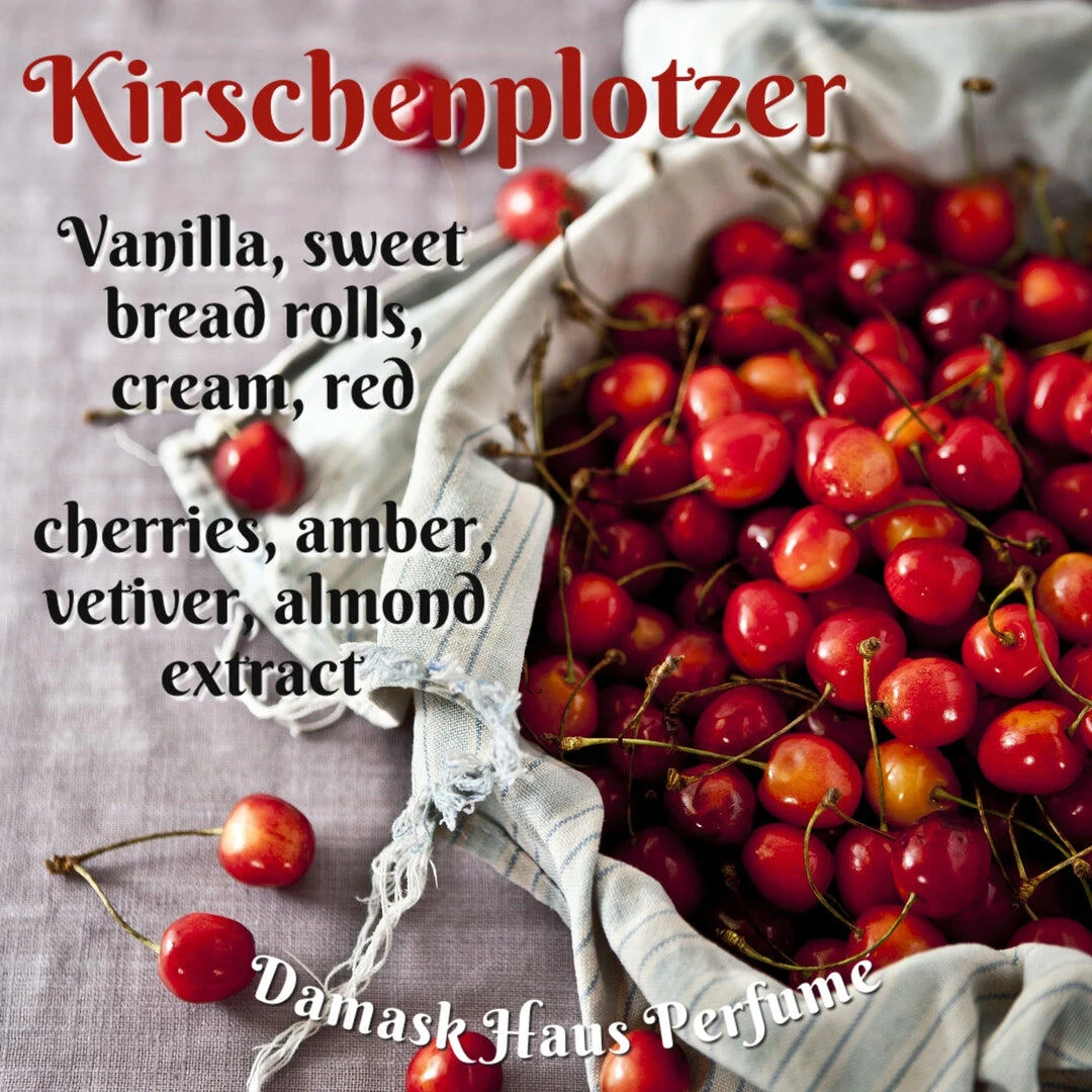 Kirschenplotzer di Damask Haus è una fraganza della famiglia olfattiva orientale vaniglia, unisex. Lanciata nel 2021, questa composizione è firmata dal profumiere Bri Beyer. La nota di testa presenta ciliegia; le note di cuore rivelano toni cremosi, mandorla e pane; mentre le note di fondo chiudono la piramide olfattiva con vaniglia, vetiver e ambra.