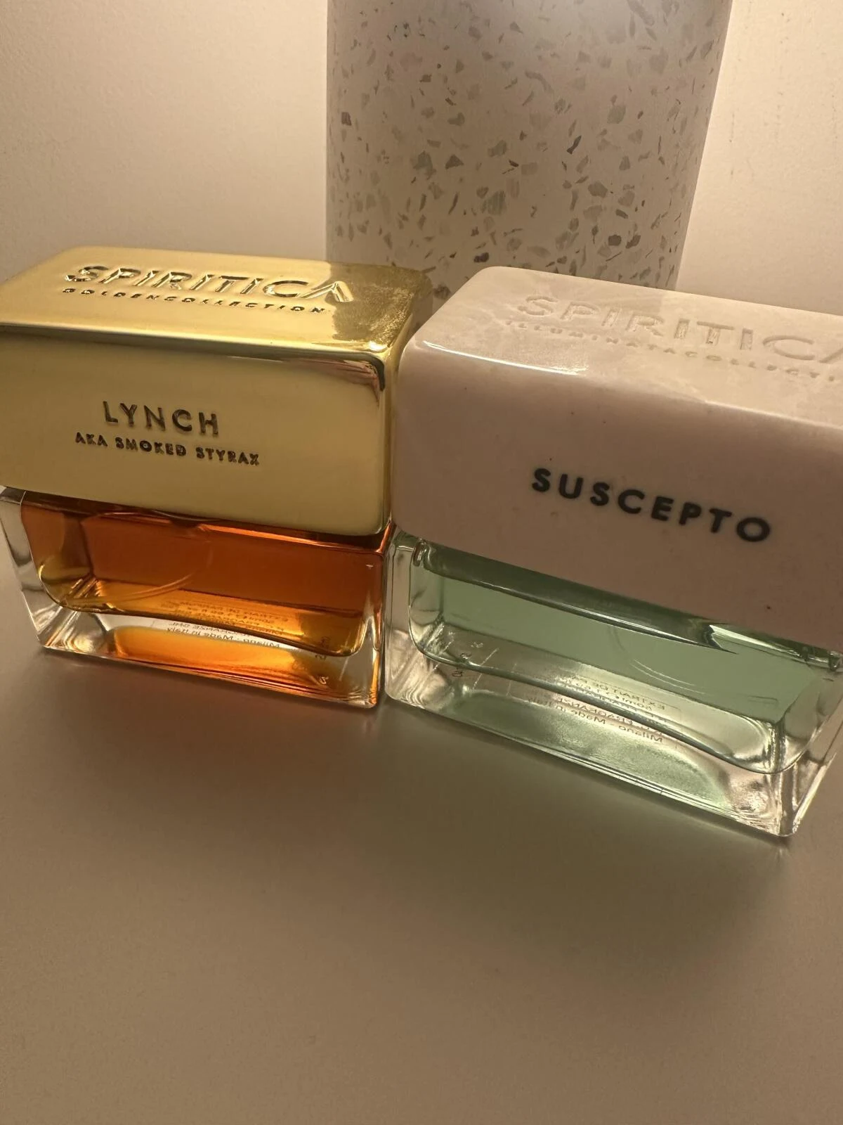 Suscepto di Spiritica è una fragranza della famiglia olfattiva acquatica aromatico, per uomo e donna. Lanciata nel 2024, questa composizione è firmata dal profumiere Daniele Muratori Caputo. L'apertura presenta eucalipto, note marine, menta piperita, note ozoniche e bergamotto, offrendo un inizio fresco e vibrante. Il cuore rivela incenso, note metalliche, rosa damascena, fumo e benzoè, creando un'atmosfera avvolgente e misteriosa. La base si fonda su eucalipto, cera d'api, miele, note metalliche, sandalo e vaniglia, chiudendo la piramide olfattiva con una persistenza calda e legnosa.